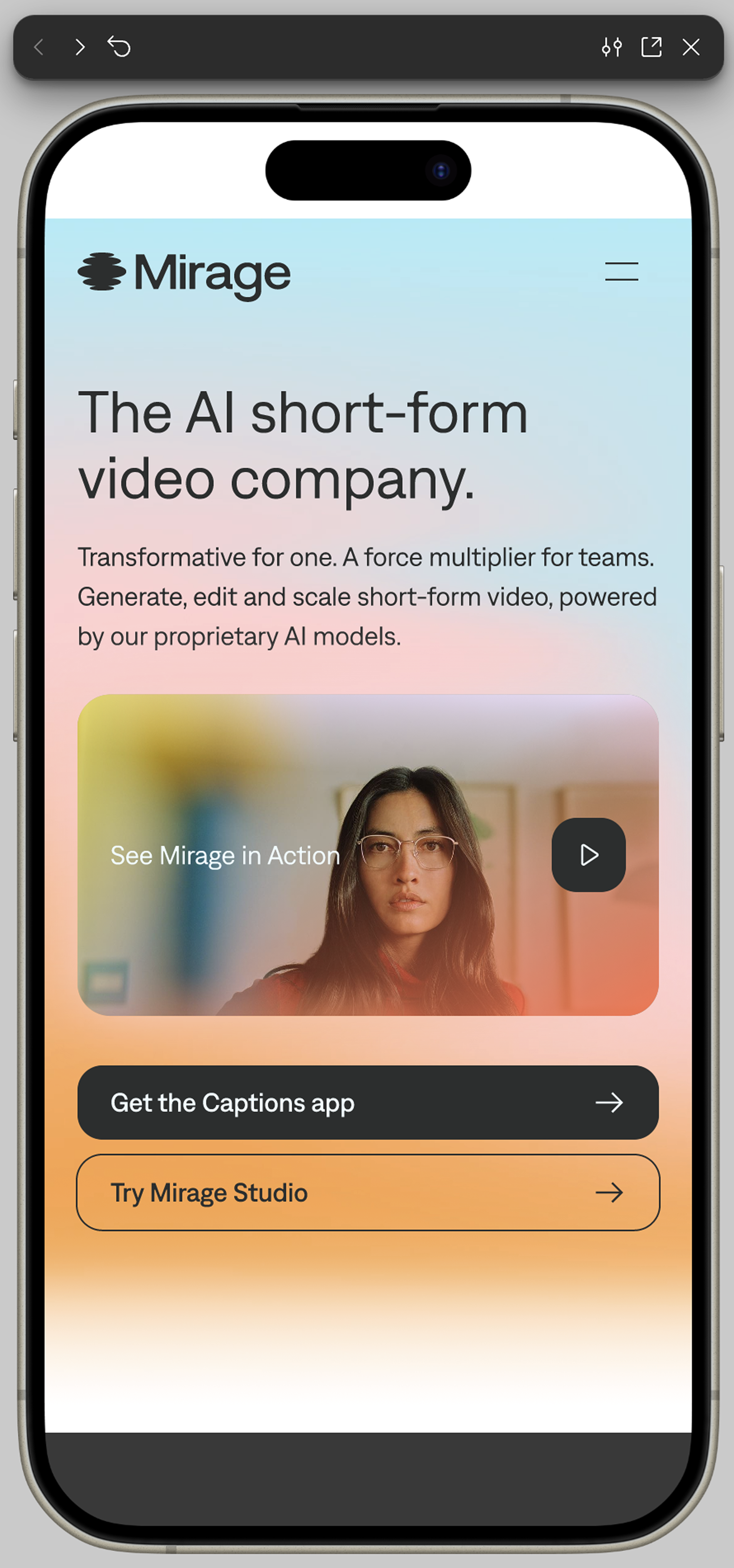 Captions had built powerful AI video creation capabilities inside its platform, but the potential of their flagship technology — Mirage — needed its own spotlight. Mirage is a groundbreaking AI system that generates energetic, high-converting ad content with spokespeople who don’t exist, complete with micro-expressions, body language, and brand-specific visuals.